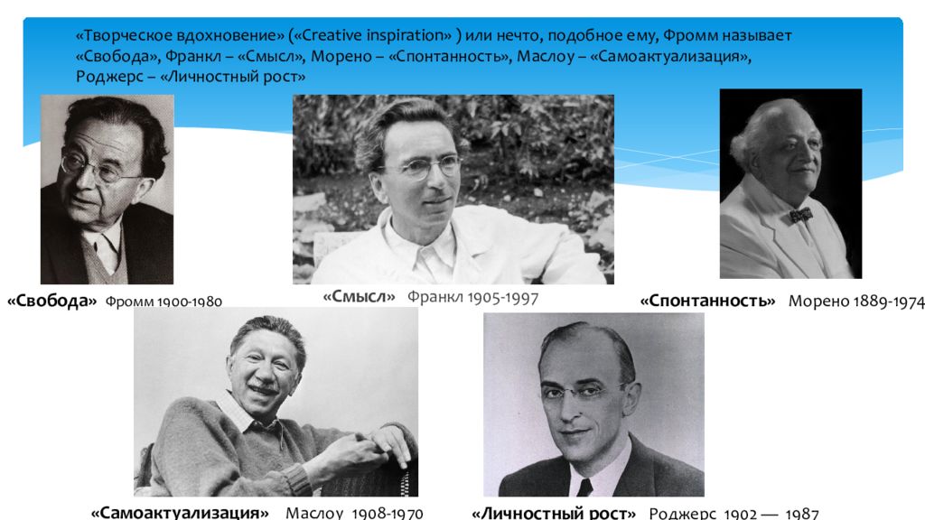 «Свобода » Фромм 1900-1980 «Смысл » Франкл 1905-1997 «Спонтанность » Морено 1889-1974 « Самоактуализация » Маслоу_1908-1970 «Личностный рост » Роджерс 1902 — 1987 «Творческое вдохновение» (« Creative inspiration » ) или нечто, подобное ему, Фромм называет «Свобода», Франкл – «Смысл», Морено – «Спонтанность», Маслоу – « Самоактуализация », Роджерс – «Личностный рост »