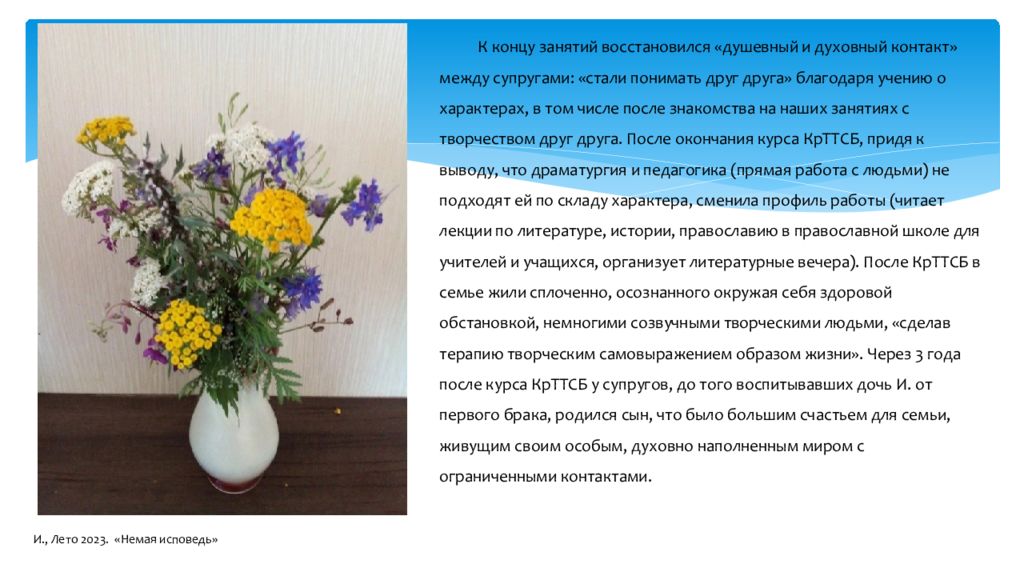 И., Лето 2023. «Немая исповедь» К концу занятий восстановился «душевный и духовный контакт» между супругами: «стали понимать друг друга» благодаря учению о характерах, в том числе после знакомства на наших занятиях с творчеством друг друга. После окончания курса КрТТСБ, придя к выводу, что драматургия и педагогика (прямая работа с людьми) не подходят ей по складу характера, сменила профиль работы (читает лекции по литературе, истории, православию в православной школе для учителей и учащихся, организует литературные вечера). После КрТТСБ в семье жили сплоченно, осознанного окружая себя здоровой обстановкой, немногими созвучными творческими людьми, «сделав терапию творческим самовыражением образом жизни». Через 3 года после курса КрТТСБ у супругов, до того воспитывавших дочь И. от первого брака, родился сын, что было большим счастьем для семьи, живущим своим особым, духовно наполненным миром с ограниченными контактами.