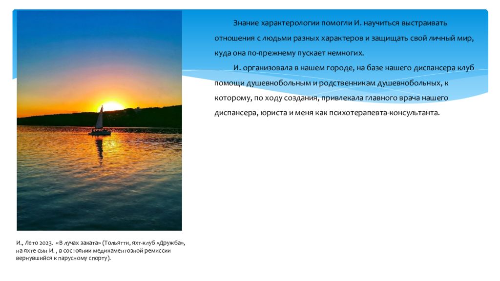 И., Лето 2023. «В лучах заката» (Тольятти, яхт-клуб «Дружба», на яхте сын И., в состоянии медикаментозной ремиссии вернувшийся к парусному спорту). Знание характерологии помогли И. научиться выстраивать отношения с людьми разных характеров и защищать свой личный мир, куда она по-прежнему пускает немногих. И. организовала в нашем городе, на базе нашего диспансера клуб помощи душевнобольным и родственникам душевнобольных, к которому, по ходу создания, привлекала главного врача нашего диспансера, юриста и меня как психотерапевта-консультанта.