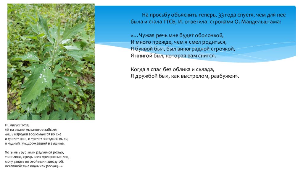 На просьбу объяснить теперь, 33 года спустя, чем для нее была и стала ТТСБ, И. ответила строками О. Мандельштама: «…Чужая речь мне будет оболочкой, И много прежде, чем я смел родиться, Я буквой был, был виноградной строчкой, Я книгой был, которая вам снится. Когда я спал без облика и склада, Я дружбой был, как выстрелом, разбужен». И., август 2023. «И на земле мы многое забыли: лишь изредка воспомнится во сне и трепет наш, и трепет звездной пыли, и чудный гул, дрожавший в вышине. Хоть мы грустим и радуемся розно, твое лицо, средь всех прекрасных лиц, могу узнать по этой пыли звездной, оставшейся на кончиках ресниц...»