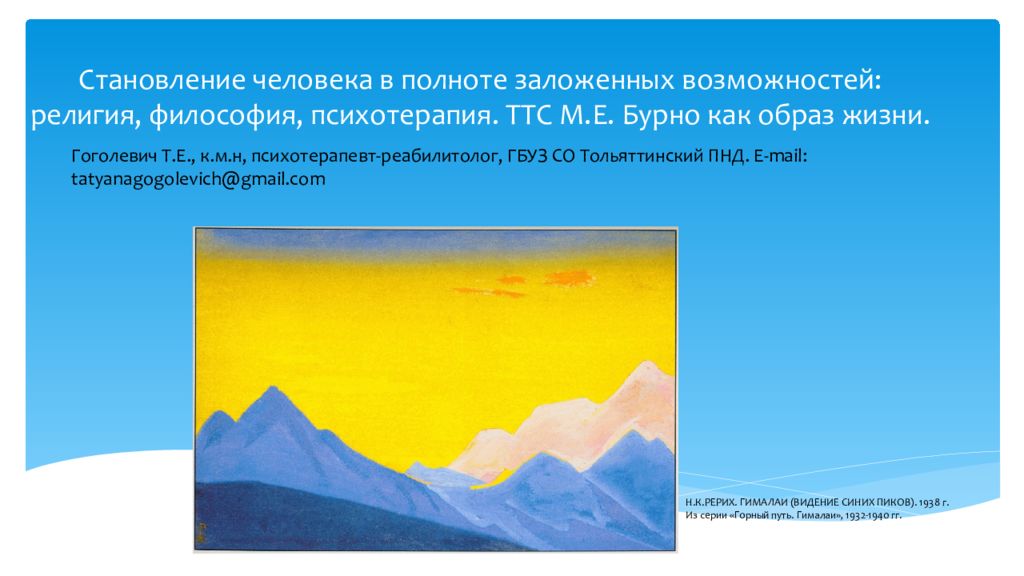 Н.К.РЕРИХ. ГИМАЛАИ (ВИДЕНИЕ СИНИХ ПИКОВ). 1938 г. Из серии « Горный путь. Гималаи», 1932-1940 гг. Гоголевич Т.Е., к.м.н, психотерапевт- реабилитолог, ГБУЗ СО Тольяттинский ПНД. E- mail : tatyanagogolevich@gmail.com