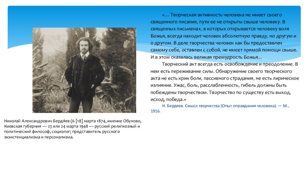 «… Творческая активность человека не имеет своего священного писания, пути ее не открыты свыше человеку. В священных письменах, в которых открывается человеку воля Божья, всегда находит человек абсолютную правду, но другую и о другом. В деле творчества человек как бы предоставлен самому себе, оставлен с собой, не имеет прямой помощи свыше. И в этом сказалась великая премудрость Божья … Творческий акт всегда есть освобождение и преодоление. В нем есть переживание силы. Обнаружение своего творческого акта не есть крик боли, пассивного страдания, не есть лирическое излияние. Ужас, боль, расслабленность, гибель должны быть побеждены творчеством. Творчество по существу есть выход, исход, победа. » Н. Бердяев. Смысл творчества (Опыт оправдания человека). — М., 1916. Николай Александрович Бердя́ев (6 [18] марта 1874, имение Обухово, Киевская губерния — 23 или 24 марта 1948 — русский религиозный и политический философ, социолог; представитель русского экзистенциализмa и персонализма.