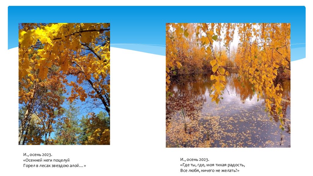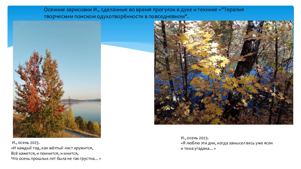 И., осень 2023. «И каждый год, как жёлтый лист кружится, Всё кажется, и помнится, и мнится, Что осень прошлых лет была не так грустна…» И., осень 2023. «Я люблю эти дни, когда замысел весь уже ясен и тема угадана…» Осенние зарисовки И., сделанные во время прогулок в духе и технике «"Терапия творческим поиском одухотворённости в повседневном".