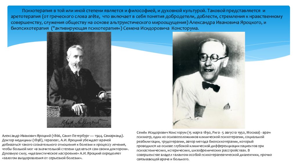 Илл. 1б. «Семья» Рис. С. Психотерапия в той или иной степени является и философией, и духовной культурой. Таковой представляется и аретотерапия (от греческого слова arête, что включает в себя понятия добродетели, доблести, стремления к нравственному совершенству, служения обществу на основе альтруистического мироощущения) Александра Ивановича Яроцкого, и биопсихотерапия ("активирующая психотерапия«) Семена Исидоровича Консторума. Семён Исидорович Консторум (15 марта 1890, Рига - 5 августа 1950, Москва) - врач-психиатр, один из основоположников клинической психотерапии, социальной реабилитации, трудотерапии, автор метода биопсихотерапии, который проводился на основе глубокой клинической дифференциации пациентов при психастенических, истерических, шизофренических расстройствах. В совершенстве владел талантом особой психотерапевтической диалектики, прочно связывающей врача и больного. Александр Иванович Яроцкий (1866, Санкт-Петербург — 1944, Самарканд ). Доктор медицины (1898), терапевт, А.И. Яроцкий убеждает врачей добиваться такого сознательного отношения к болезни и процессу лечения, чтобы больной мог «в значительной степени сделаться сам своим доктором». Духовную силу, «идеалистическое настроение» А.И. Яроцкий определяет «залогом выздоровления от серьезной болезни».