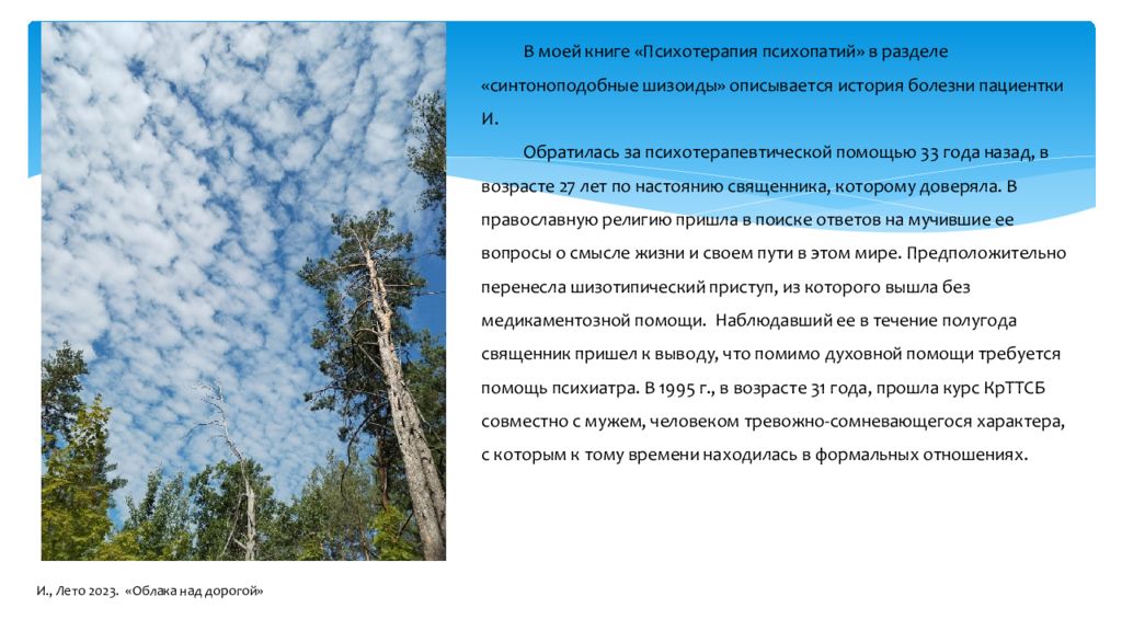 И., Лето 2023. «Облака над дорогой» В моей книге «Психотерапия психопатий» в разделе « синтоноподобные шизоиды » описывается история болезни пациентки И. Обратилась за психотерапевтической помощью 33 года назад, в возрасте 27 лет по настоянию священника, которому доверяла. В православную религию пришла в поиске ответов на мучившие ее вопросы о смысле жизни и своем пути в этом мире. Предположительно перенесла шизотипический приступ, из которого вышла без медикаментозной помощи. Наблюдавший ее в течение полугода священник пришел к выводу, что помимо духовной помощи требуется помощь психиатра. В 1995 г., в возрасте 31 года, прошла курс КрТТСБ совместно с мужем, человеком тревожно-сомневающегося характера, с которым к тому времени находилась в формальных отношениях.