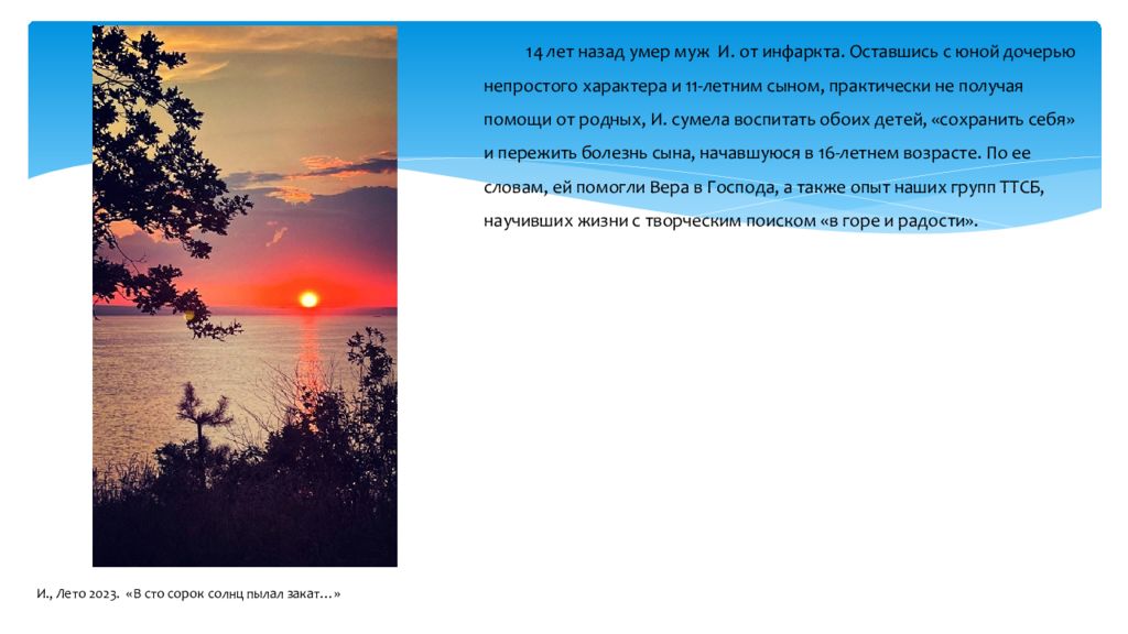 И., Лето 2023. «В сто сорок солнц пылал закат…» 14 лет назад умер муж И. от инфаркта. Оставшись с юной дочерью непростого характера и 11-летним сыном, практически не получая помощи от родных, И. сумела воспитать обоих детей, «сохранить себя» и пережить болезнь сына, начавшуюся в 16-летнем возрасте. По ее словам, ей помогли Вера в Господа, а также опыт наших групп ТТСБ, научивших жизни с творческим поиском «в горе и радости».