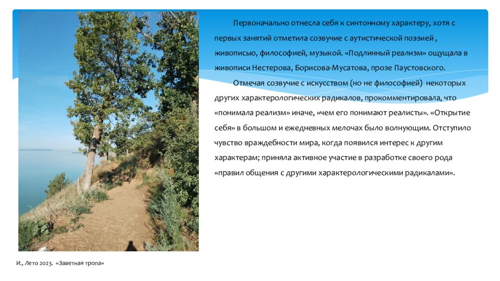 И., Лето 2023. «Заветная тропа» Первоначально отнесла себя к синтонному характеру, хотя с первых занятий отметила созвучие с аутистической поэзией, живописью, философией, музыкой. «Подлинный реализм» ощущала в живописи Нестерова, Борисова- Мусатова, прозе Паустовского. Отмечая созвучие с искусством (но не философией) некоторых других характерологических радикалов, прокомментировала, что «понимала реализм» иначе, «чем его понимают реалисты». «Открытие себя» в большом и ежедневных мелочах было волнующим. Отступило чувство враждебности мира, когда появился интерес к другим характерам; приняла активное участие в разработке своего рода «правил общения с другими характерологическими радикалами».