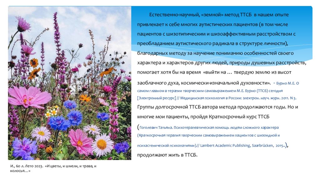 И., 60 л. Лето 2023. «И цветы, и шмели, и трава, и колосья…» Естественно-научный, «земной» метод ТТСБ в нашем опыте привлекает к себе многих аутистических пациентов (в том числе пациентов с шизотипическим и шизоаффективным расстройством с преобладанием аутистического радикала в структуре личности), благодарных методу за научение пониманию особенностей своего характера и характеров других людей, природы душевных расстройств, помогает хотя бы на время «выйти на … твердую землю из высот заоблачного духа, космически-изначальной духовности». - Бурно М.Е. О самом главном в терапии творческим самовыражением М.Е. Бурно (ТТСБ) сегодня [Электронный ресурс] // Медицинская психология в России: электрон. науч. журн. 2011. N 3. Группы долгосрочной ТТСБ автора метода продолжаются годы. Но и многие мои пациенты, пройдя Краткосрочный курс ТТСБ ( Гоголевич Татьяна. Психотерапевтическая помощь людям сложного характера (Краткосрочная терапия творческим самовыражением пациентов с шизоидной и психастенической психопатиями).// Lambert Academic Publishing, Saarbrücken, 2015.), продолжают жить в ТТСБ.