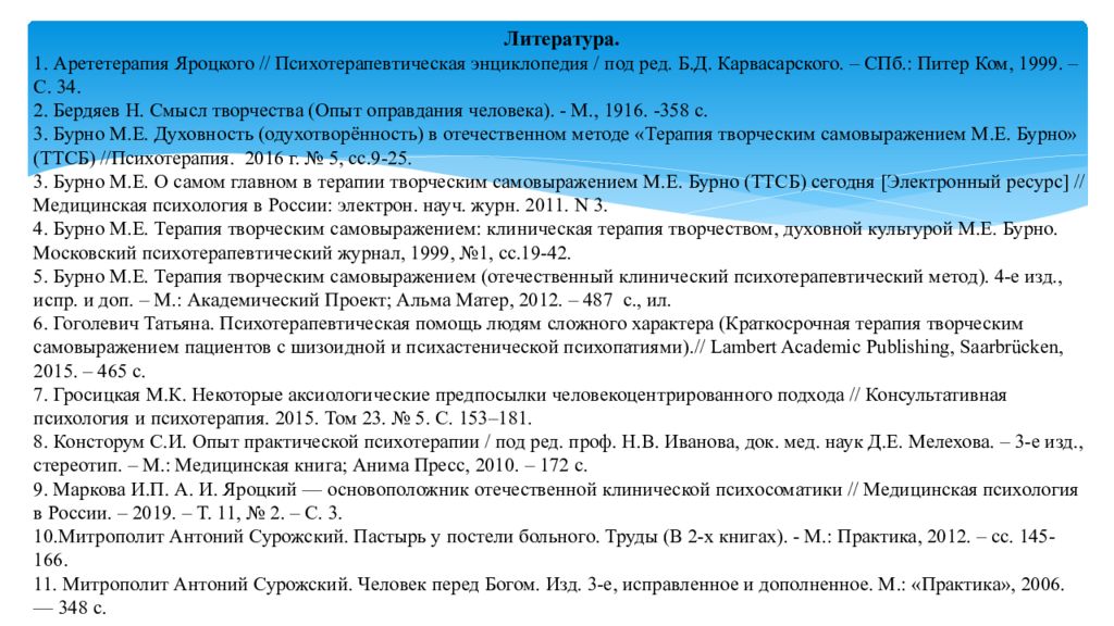 Литература. 1. Арететерапия Яроцкого // Психотерапевтическая энциклопедия / под ред. Б.Д. Карвасарского. – СПб.: Питер Ком, 1999. – С. 34. 2. Бердяев Н. Смысл творчества (Опыт оправдания человека). - М., 1916. -358 с. 3. Бурно М.Е. Духовность (одухотворённость) в отечественном методе «Терапия творческим самовыражением М.Е. Бурно» (ТТСБ) //Психотерапия. 2016 г. № 5, сс.9-25. 3. Бурно М.Е. О самом главном в терапии творческим самовыражением М.Е. Бурно (ТТСБ) сегодня [Электронный ресурс] // Медицинская психология в России: электрон. науч. журн. 2011. N 3. 4. Бурно М.Е. Терапия творческим самовыражением: клиническая терапия творчеством, духовной культурой М.Е. Бурно. Московский психотерапевтический журнал, 1999, №1, сс.19-42. 5. Бурно М.Е. Терапия творческим самовыражением (отечественный клинический психотерапевтический метод). 4-е изд., испр. и доп. – М.: Академический Проект; Альма Матер, 2012. – 487 с., ил. 6. Гоголевич Татьяна. Психотерапевтическая помощь людям сложного характера (Краткосрочная терапия творческим самовыражением пациентов с шизоидной и психастенической психопатиями).// Lambert Academic Publishing, Saarbrücken, 2015. – 465 с. 7. Гросицкая М.К. Некоторые аксиологические предпосылки человекоцентрированного подхода // Консультативная психология и психотерапия. 2015. Том 23. № 5. С. 153–181. 8. Консторум С.И. Опыт практической психотерапии / под ред. проф. Н.В. Иванова, док. мед. наук Д.Е. Мелехова. – 3-е изд., стереотип. – М.: Медицинская книга; Анима Пресс, 2010. – 172 с. 9. Маркова И.П. А. И. Яроцкий — основоположник отечественной клинической психосоматики // Медицинская психология в России. – 2019. – T. 11, № 2. – C. 3. 10.Митрополит Антоний Сурожский. Пастырь у постели больного. Труды (В 2-х книгах). - М.: Практика, 2012. – сс. 145-166. 11. Митрополит Антоний Сурожский. Человек перед Богом. Изд. 3-е, исправленное и дополненное. М.: «Практика», 2006. — 348 с.