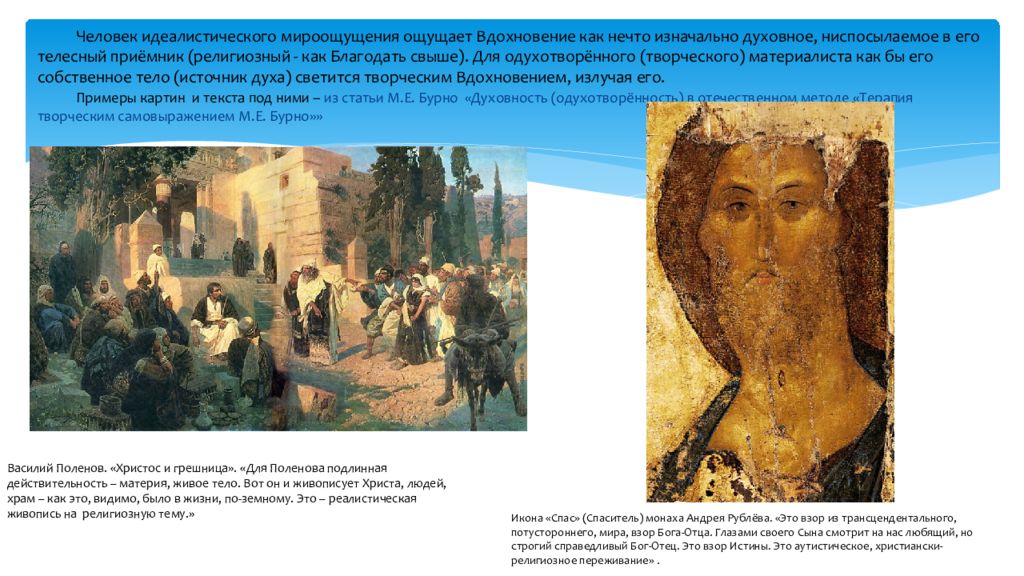 Илл. 1б. «Семья» Рис. С. Человек идеалистического мироощущения ощущает Вдохновение как нечто изначально духовное, ниспосылаемое в его телесный приёмник (религиозный - как Благодать свыше). Для одухотворённого (творческого) материалиста как бы его собственное тело (источник духа) светится творческим Вдохновением, излучая его. Примеры картин и текста под ними – из статьи М.Е. Бурно «Духовность (одухотворённость) в отечественном методе «Терапия творческим самовыражением М.Е. Бурно»» Икона «Спас» (Спаситель) монаха Андрея Рублёва. «Это взор из трансцендентального, потустороннего, мира, взор Бога-Отца. Глазами своего Сына смотрит на нас любящий, но строгий справедливый Бог-Отец. Это взор Истины. Это аутистическое, христиански-религиозное переживание». Василий Поленов. « Христос и грешница ». « Для Поленова подлинная действительность – материя, живое тело. Вот он и живописует Христа, людей, храм – как это, видимо, было в жизни, по-земному. Это – реалистическая живопись на религиозную тему.»
