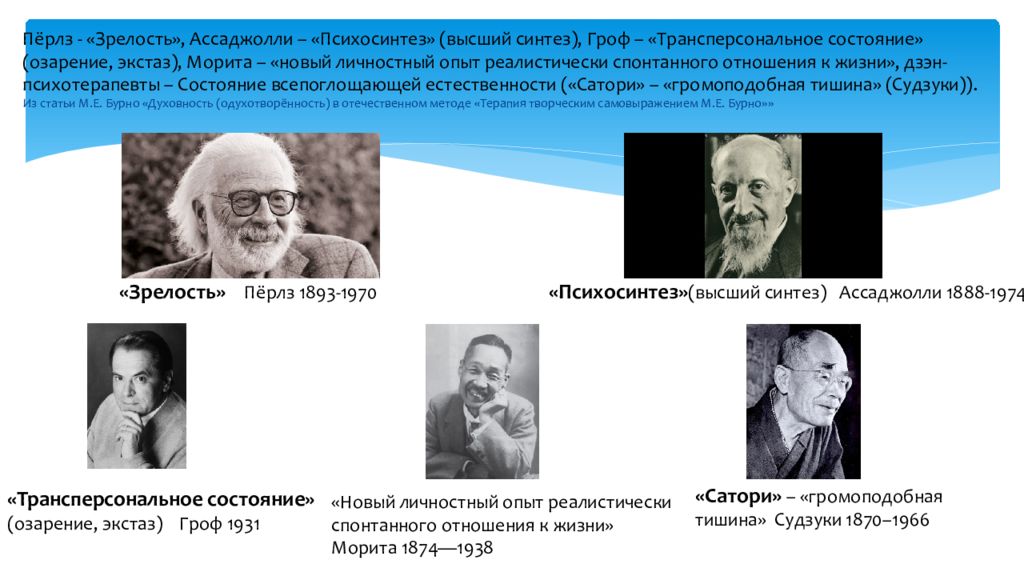 Пёрлз - «Зрелость», Ассаджолли – « Психосинтез » (высший синтез), Гроф – « Трансперсональное состояние» (озарение, экстаз), Морита – «новый личностный опыт реалистически спонтанного отношения к жизни», дзэн-психотерапевты – Состояние всепоглощающей естественности (« Сатори » – «громоподобная тишина» (Судзуки)). Из статьи М.Е. Бурно «Духовность (одухотворённость) в отечественном методе «Терапия творческим самовыражением М.Е. Бурно »» «Зрелость» Пёрлз 1893-1970 « Психосинтез » ( высший синтез ) Ассаджолли 1888-1974 «Новый личностный опыт реалистически спонтанного отношения к жизни » Морита 1874—1938 « Сатори » – «громоподобная тишина» Судзуки 1870–1966 « Трансперсональное состояние» (озарение, экстаз ) Гроф 1931