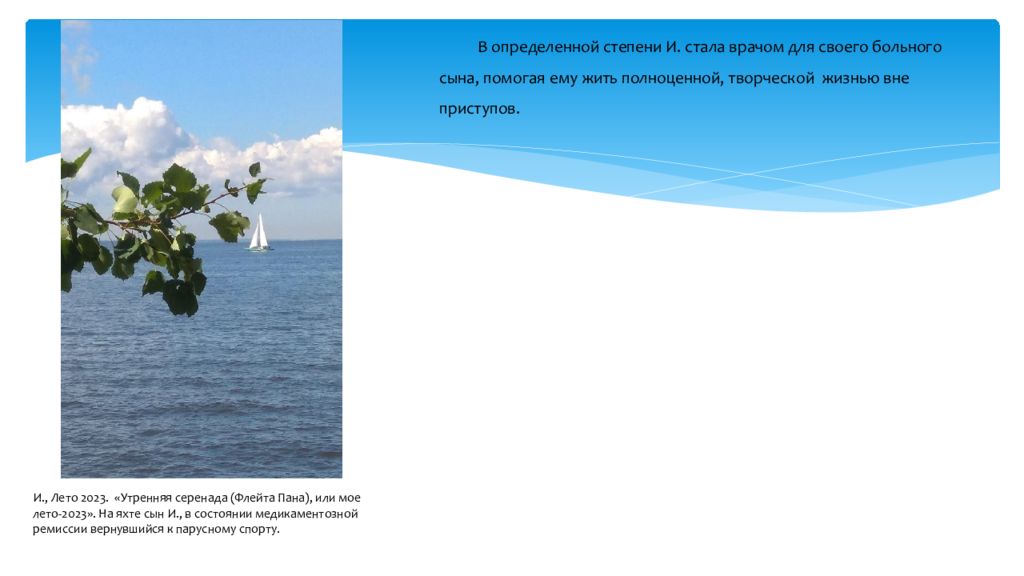 И., Лето 2023. «Утренняя серенада (Флейта Пана), или мое лето-2023». На яхте сын И., в состоянии медикаментозной ремиссии вернувшийся к парусному спорту. В определенной степени И. стала врачом для своего больного сына, помогая ему жить полноценной, творческой жизнью вне приступов.