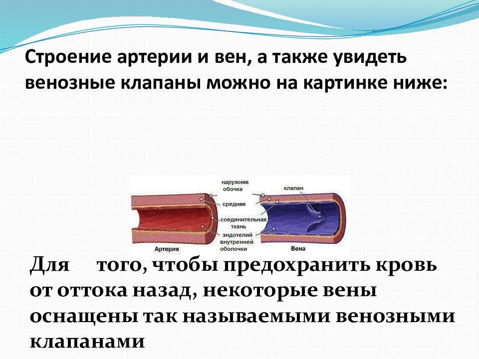 Слайд 10: Строение артерии и вен, а также увидеть венозные клапаны можно на картинке ниже: