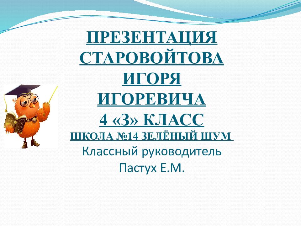 Первый слайд презентации: ПРЕЗЕНТАЦИЯ СТАРОВОЙТОВА ИГОРЯ ИГОРЕВИЧА 4 «З» КЛАСС ШКОЛА №14 ЗЕЛЁНЫЙ ШУМ Классный руководитель Пастух Е.М