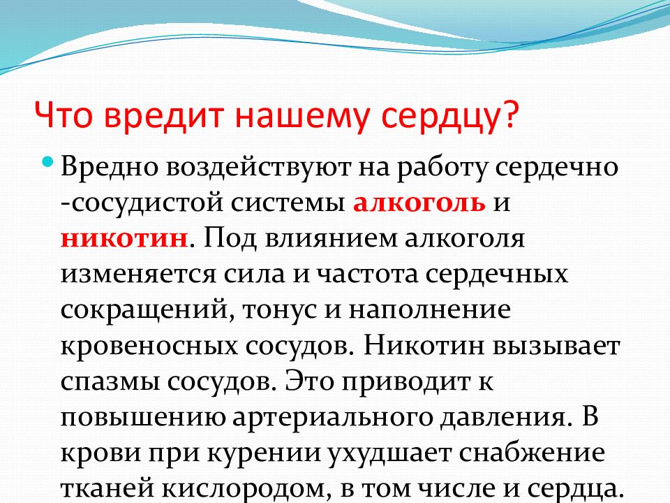 Вредно воздействуют на работу сердечно -сосудистой системы алкоголь и никотин. Под влиянием алкоголя изменяется сила и частота сердечных сокращений, тонус и наполнение кровеносных сосудов. Никотин вызывает спазмы сосудов. Это приводит к повышению артериального давления. В крови при курении ухудшает снабжение тканей кислородом, в том числе и сердца.
