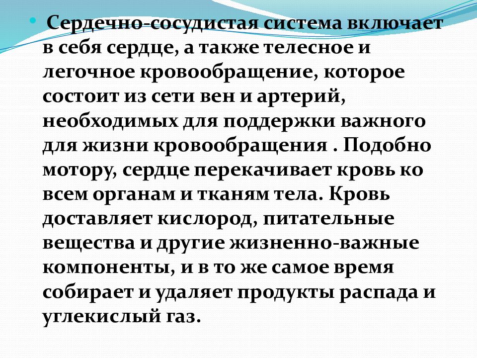 Сердечно-сосудистая система включает в себя сердце, а также телесное и легочное кровообращение, которое состоит из сети вен и артерий, необходимых для поддержки важного для жизни кровообращения. Подобно мотору, сердце перекачивает кровь ко всем органам и тканям тела. Кровь доставляет кислород, питательные вещества и другие жизненно-важные компоненты, и в то же самое время собирает и удаляет продукты распада и углекислый газ.
