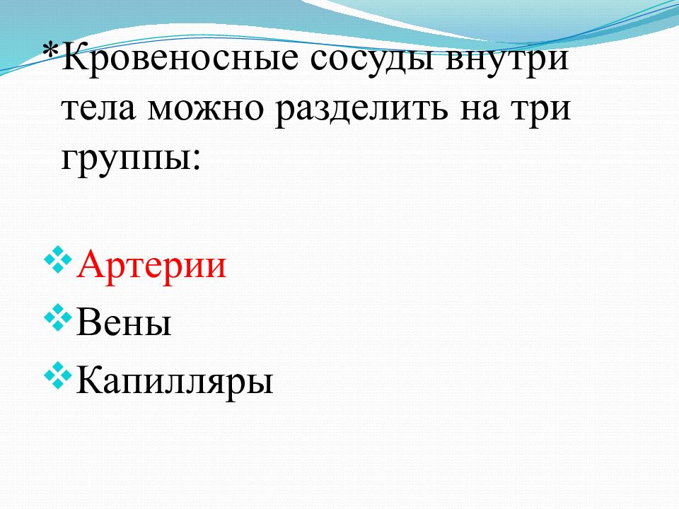 * Кровеносные сосуды внутри тела можно разделить на три группы: Артерии Вены Капилляры