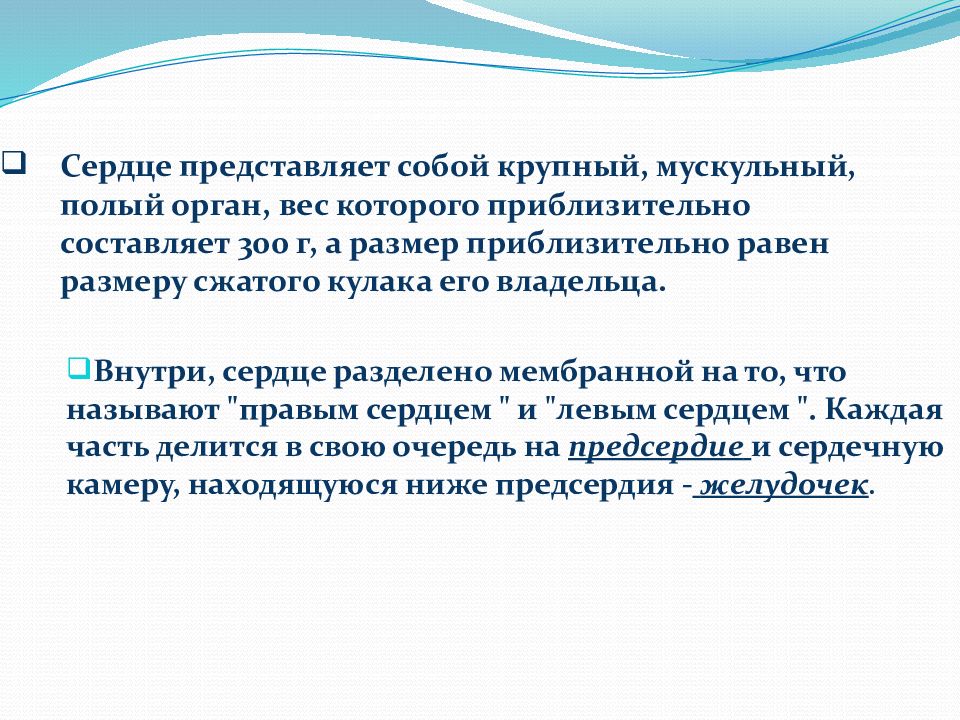 Слайд 6: Сердце представляет собой крупный, мускульный, полый орган, вес которого приблизительно составляет 300 г, а размер приблизительно равен размеру сжатого кулака его владельца