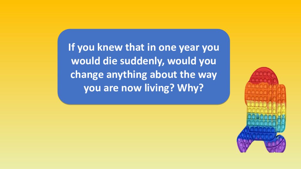 If you knew that in one year you would die suddenly, would you change anything about the way you are now living? Why ?