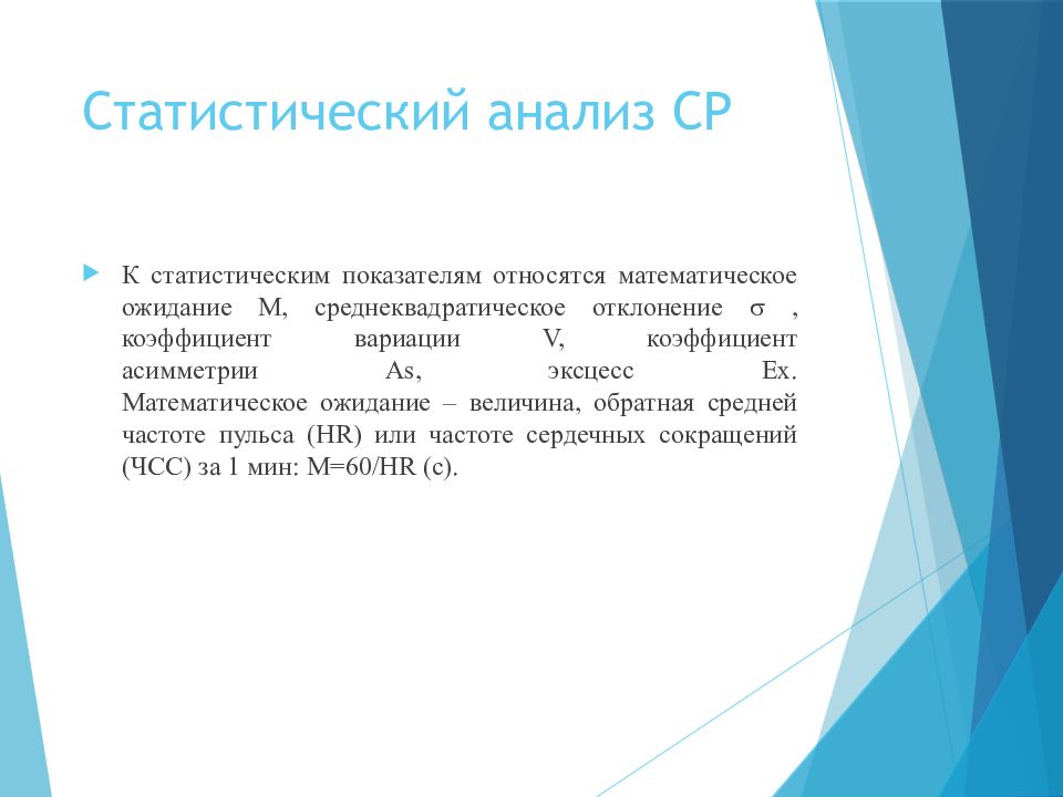 К статистическим показателям относятся математическое ожидание М, среднеквадратическое отклонение , коэффициент вариации V, коэффициент асимметрии As, эксцесс Ex. Математическое ожидание – величина, обратная средней частоте пульса (HR) или частоте сердечных сокращений (ЧСС) за 1 мин: М=60/HR (c).