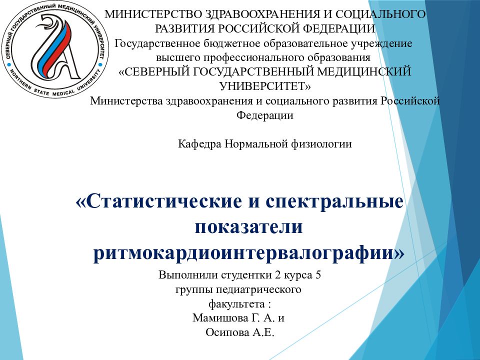 «Статистические и спектральные показатели ритмокардиоинтервалографии » МИНИСТЕРСТВО ЗДРАВООХРАНЕНИЯ И СОЦИАЛЬНОГО РАЗВИТИЯ РОССИЙСКОЙ ФЕДЕРАЦИИ Государственное бюджетное образовательное учреждение высшего профессионального образования «СЕВЕРНЫЙ ГОСУДАРСТВЕННЫЙ МЕДИЦИНСКИЙ УНИВЕРСИТЕТ» Министерства здравоохранения и социального развития Российской Федерации Кафедра Нормальной физиологии Выполнили студентки 2 курса 5 группы педиатрического факультета : Мамишова Г. А. и Осипова А.Е.