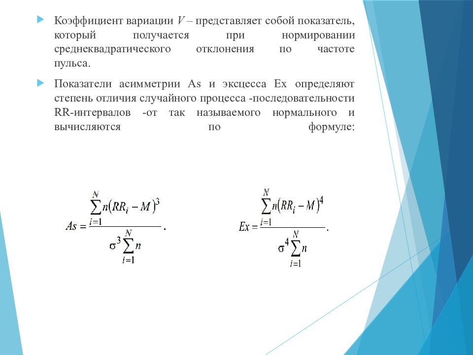 Коэффициент вариации V – представляет собой показатель, который получается при нормировании среднеквадратического отклонения по частоте пульса. Показатели асимметрии Аs и эксцесса Еx определяют степень отличия случайного процесса -последовательности RR-интервалов -от так называемого нормального и вычисляются по формуле: