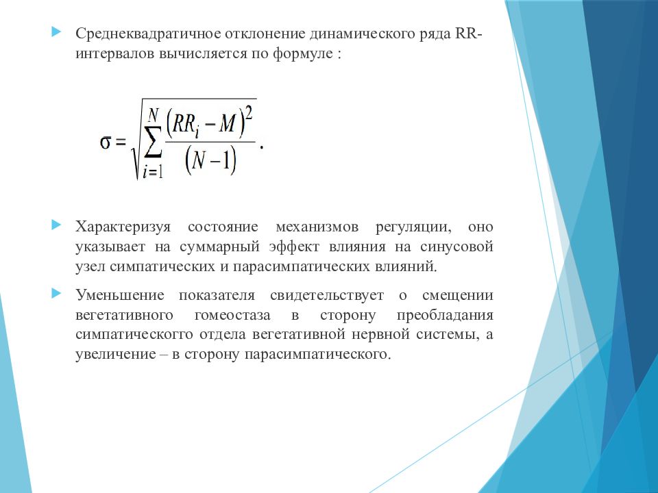 Среднеквадратичное отклонение динамического ряда RR-интервалов вычисляется по формуле : Характеризуя состояние механизмов регуляции, оно указывает на суммарный эффект влияния на синусовой узел симпатических и парасимпатических влияний. Уменьшение показателя свидетельствует о смещении вегетативного гомеостаза в сторону преобладания симпатическогго отдела вегетативной нервной системы, а увеличение – в сторону парасимпатического.