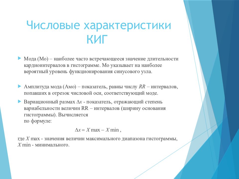 Мода (Мо) – наиболее часто встречающееся значение длительности кардиоинтервалов в гистограмме. Мо указывает на наиболее вероятный уровень функционирования синусового узла. Амплитуда мода ( Амо ) – показатель, равны числу RR – интервалов, попавших в отрезок числовой оси, соответствующий моде. Вариационный размах x - показатель, отражающий степень вариабельности величин RR – интервалов (ширину основания гистограммы). Вычисляется по формуле: x X max X min, где X max - значения величин максимального диапазона гистограммы, X min - минимального.