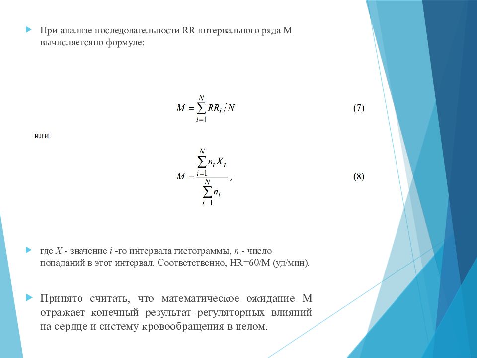 При анализе последовательности RR интервального ряда М вычисляетсяпо формуле: где X - значение i -го интервала гистограммы, n - число попаданий в этот интервал. Соответственно, HR=60/М (уд/мин). Принято считать, что математическое ожидание М отражает конечный результат регуляторных влияний на сердце и систему кровообращения в целом.