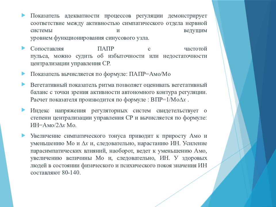 Показатель адекватности процессов регуляции демонстрирует соответствие между активностью симпатического отдела нервной системы и ведущим уровнем функционирования синусового узла. Сопоставляя ПАПР с частотой пульса, можно судить об избыточности или недостаточности централизации управления СР. Показатель вычисляется по формуле: ПАПР= Амо /Мо Вегетативный показатель ритма позволяет оценивать вегетативный баланс с точки зрения активности автономного контура регуляции. Расчет показателя производится по формуле : ВПР=1/ Мо x. Индекс напряжения регуляторных систем свидетельствует о степени централизации управления СР и вычисляется по формуле: ИН= Амо /2 x Мо. Увеличение симпатического тонуса приводит к приросту Амо и уменьшению Мо и x и, следовательно, нарастанию ИН. Усиление парасимпатических влияний, наоборот, ведет к уменьшению Амо, увеличению величины Мо и, следовательно, ИН. У здоровых людей в состоянии физического и психического покоя значения ИН составляют 80-140.