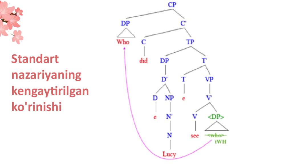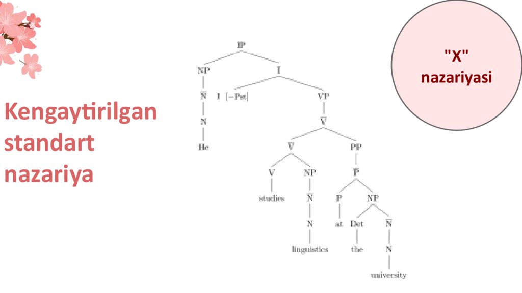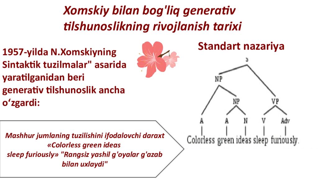 X omskiy bilan bog'liq generativ tilshunoslikning rivojlanish tarixi 1957-yilda N.Xomskiyning Sintaktik tuzilmalar " asarida yaratilganidan beri generativ tilshunoslik ancha oʻzgardi: S t a n d a r t n a z a r i y a Mashhur jumlaning tuzilishini ifodalovchi daraxt «Colorless green ideas sleep furiously» "Rangsiz yashil g'oyalar g'azab bilan uxlaydi"