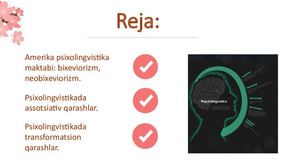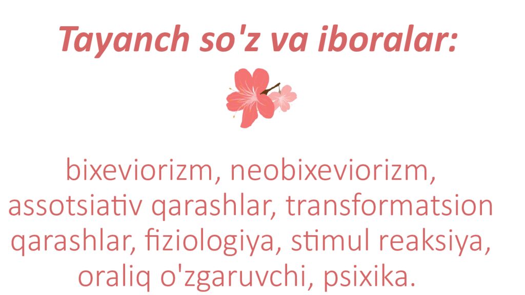 A m e r i k a psix o l i ngvistika m a k t a b i : b i x e v i o r i z m, n e o b i x e v i o r i z m. Psixolingvistika d a a s s o tsiativ qarashlar. Psixolingvistika d a transformat s i o n q a r a s h l a r.