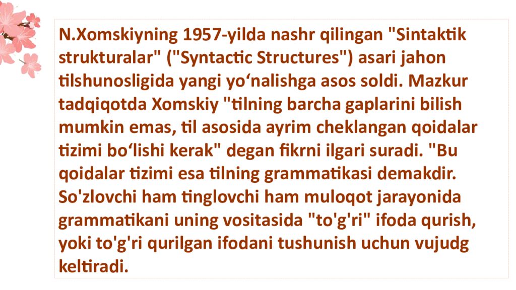 N.Xomskiyning 1957-yilda nashr qilingan "Sintaktik strukturalar" ("Syntactic Structures") asari jahon tilshunosligida yangi yoʻnalishga asos soldi. Mazkur tadqiqotda Xomskiy "tilning barcha gaplarini bilish mumkin emas, til asosida ayrim cheklangan qoidalar tizimi boʻlishi kerak" degan fikrni ilgari suradi. "Bu qoidalar tizimi esa tilning grammatikasi demakdir. So'zlovchi ham tinglovchi ham muloqot jarayonida grammatikani uning vositasida "to'g'ri" ifoda qurish, yoki to'g'ri qurilgan ifodani tushunish u c h u n v u j u d g keltirad i.