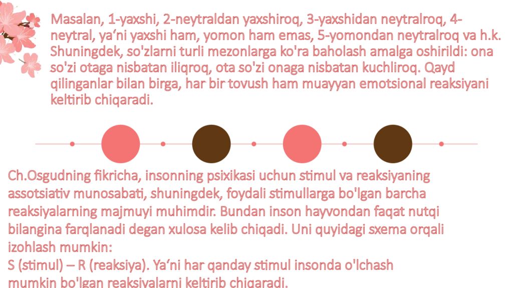 Ch.Osgudning fikricha, insonning psixikasi uchun stimul va reaksiyaning assotsiativ munosabati, shuningdek, foydali stimullarga bo ' lgan barcha reaksiyalarning majmuyi muhimdir. Bundan inson hayvondan faqat nutqi bilangina farqlanadi degan xulosa kelib chiqadi. Uni quyidagi sxema orqali izohlash mumkin: S (stimul) – R (reaksiya). Ya‘ni har qanday stimul insonda o ' lchash mumkin bo ' lgan reaksiyalarni keltirib chiqaradi.