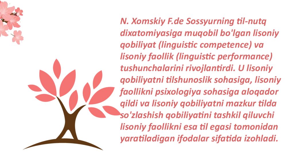 N. Xomskiy F.de Sossyurning til-nutq dixatomiyasiga muqobil bo'lgan lisoniy qobiliyat (linguistic competence) va lisoniy faollik (linguistic performance) tushunchalarini rivojlantirdi. U lisoniy qobiliyatni tilshunoslik sohasiga, lisoniy faollikni psixologiya sohasiga aloqador qildi va lisoniy qobiliyatni mazkur tilda so'zlashish qobiliyatini tashkil qiluvchi lisoniy faollikni esa til egasi tomonidan yaratiladigan ifodalar sifatida i z o h l a d i.