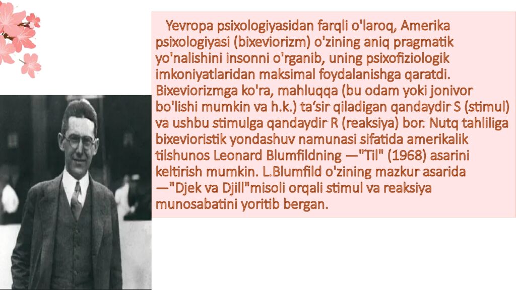 Слайд 5: Yevropa psixologiyasidan farqli o ' laroq, Amerika psixologiyasi (bixeviorizm) o ' zining aniq pragmatik yo ' nalishini insonni o ' rganib, uning psixofiziologik imkoniyatlaridan maksimal foydalanishga qaratdi. Bixeviorizmga ko ' ra, mahluqqa (bu odam yoki jonivor bo ' lishi mumkin va h.k.) ta‘sir qiladigan qandaydir S (stimul) va ushbu stimulga qandaydir R (reaksiya) bor. Nutq tahliliga bixevioristik yondashuv namunasi sifatida amerikalik tilshunos Leonard Blumfildning ― " Til " (1968) asarini keltirish mumkin. L.Blumfild o ' zining mazkur asarida ― " Djek va Djill " misoli orqali stimul va reaksiya munosabatini yoritib bergan