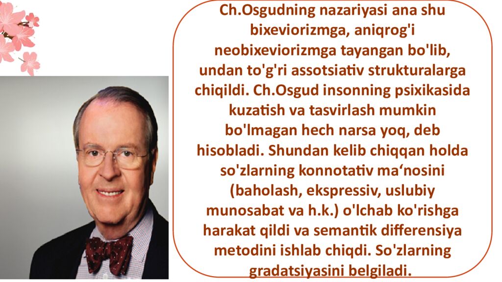 Ch.Osgudning nazariyasi ana shu bixeviorizmga, aniqrog ' i neobixeviorizmga tayangan bo ' lib, undan to ' g ' ri assotsiativ strukturalarga chiqildi. Ch.Osgud insonning psixikasida kuzatish va tasvirlash mumkin bo ' lmagan hech narsa yoq, deb hisobladi. Shundan kelib chiqqan holda so ' zlarning konnotativ ma‘nosini (baholash, ekspressiv, uslubiy munosabat va h.k.) o ' lchab ko ' rishga harakat qildi va semantik differensiya metodini ishlab chiqdi. So ' zlarning gradatsiyasini belgiladi.
