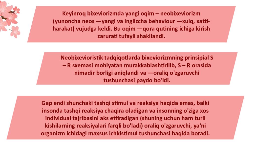 Keyinroq bixeviorizmda yangi oqim – neobixeviorizm (yunoncha neos ―yangi va inglizcha behaviour ―xulq, xatti-harakat) vujudga keldi. Bu oqim ―qora qutining ichiga kirish zarurati tufayli shakllandi. Neobixevioristik tadqiqotlarda bixeviorizmning prinsipial S – R sxemasi mohiyatan murakkablashtirilib, S – R orasida nimadir borligi aniqlandi va ―oraliq o ' zgaruvchi tushunchasi paydo bo ' ldi. ADD YOUR TEXT Gap endi shunchaki tashqi stimul v a reaksiya haqida emas, balki insonda tashqi reaksiya chaqira oladigan va insonning o ' ziga xos individual tajribasini aks ettiradigan (shuning uchun ham turli kishilarning reaksiyalari farqli bo ' ladi) oraliq o ' zgaruvchi, ya‘ni organizm ichidagi maxsus ichkistimul tushunchasi haqida boradi.