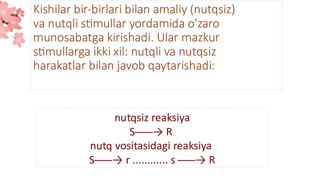 Слайд 6: Kishilar bir-birlari bilan amaliy (nutqsiz) va nutqli stimullar yordamida o ' zaro munosabatga kirishadi. Ular mazkur stimullarga ikki xil: nutqli va nutqsiz harakatlar bilan javob qaytarishadi: