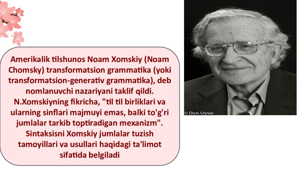 Amerikalik tilshunos Noam Xomskiy (Noam Chomsky) transformatsion grammatika (yoki transformatsion-generativ grammatika), deb nomlanuvchi nazariyani taklif qildi. N.Xomskiyning fikricha, "til til birliklari va ularning sinflari majmuyi emas, balki to'g'ri jumlalar tarkib toptiradigan mexanizm". Sintaksisni Xomskiy jumlalar tuzish tamoyillari va usullari haqidagi ta'limot sifatida belgiladi
