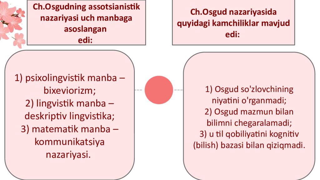 Ch.Osgudning assotsianistik nazariyasi uch manbaga asoslangan edi: 1) psixolingvistik manba – bixeviorizm; 2) lingvistik manba – deskriptiv lingvistika; 3) matematik manba – kommunikatsiya nazariyasi. Ch.Osgud nazariyasida quyidagi kamchiliklar mavjud edi: 1) Osgud so ' zlovchining niyatini o ' rganmadi; 2) Osgud mazmun bilan bilimni chegaralamadi; 3) u til qobiliyatini kognitiv (bilish) bazasi bilan qiziqmadi.