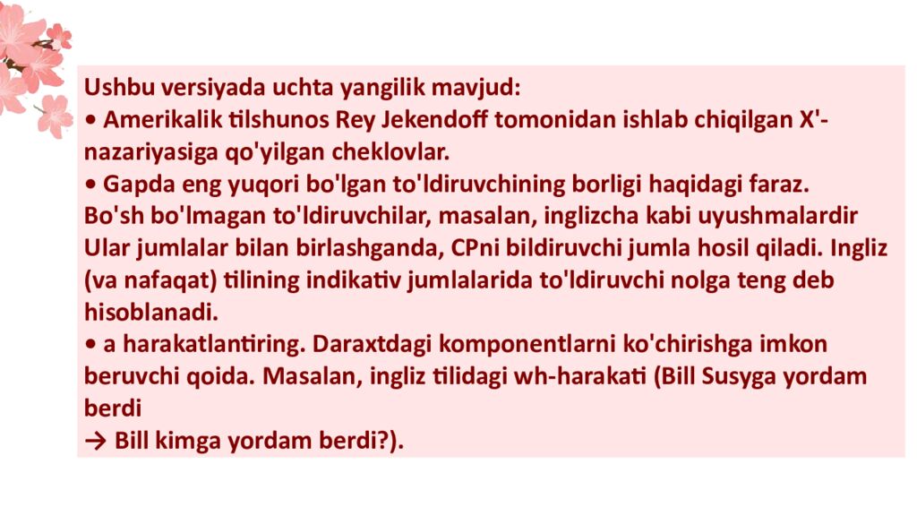 Ushbu versiyada uchta yangilik mavjud: • Amerikalik tilshunos Rey Jekendoff tomonidan ishlab chiqilgan X'- nazariyasiga qo'yilgan cheklovlar. • Gapda eng yuqori bo ' lgan to ' ldiruvchining borligi haqidagi faraz. B o'sh bo'lmagan to'ldiruvchilar, masalan, inglizcha kabi uyushmalardir Ular jumlalar bilan birlashganda, CPni bildiruvchi jumla hosil qiladi. Ingliz (va nafaqat) tilining indikativ jumlalarida to'ldiruvchi nolga teng deb hisoblanadi. • a harakatlantiring. Daraxtdagi komponentlarni ko'chirishga imkon beruvchi qoida. Masalan, ingliz tilidagi wh-harakati (Bill Susyga yordam berdi → Bill kimga yordam berdi?).