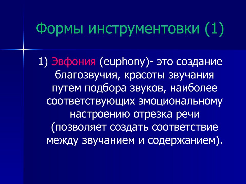 1) Эвфония (euphony)- это создание благозвучия, красоты звучания путем подбора звуков, наиболее соответствующих эмоциональному настроению отрезка речи (позволяет создать соответствие между звучанием и содержанием).