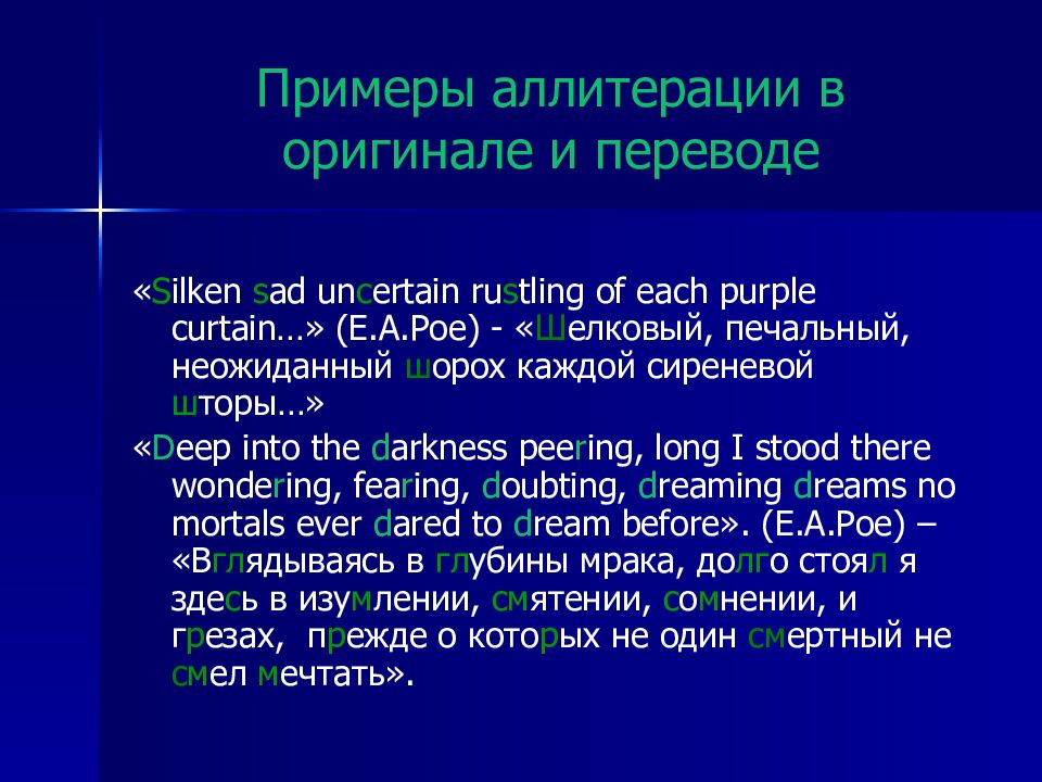 « S ilken s ad un c ertain ru s tling of each purple curtain…» (E.A.Poe) - « Ш елковый, печальный, неожиданный ш орох каждой сиреневой ш торы…» « D eep into the d arkness pee r ing, long I stood there wonde r ing, fea r ing, d oubting, d reaming d reams no mortals ever d ared to d ream before». (E.A.Poe) – «В гл ядываясь в гл убины мрака, до лг о стоя л я зде с ь в изу м лении, см ятении, с о м нении, и г р езах, п р ежде о кото р ых не один см ертный не с м ел м ечтать».