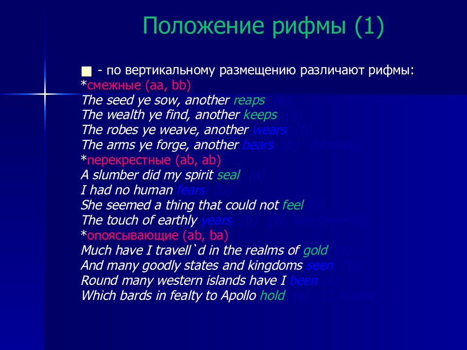 - по вертикальному размещению различают рифмы: * смежные (аа, bb) The seed ye sow, another reaps ; (a) The wealth ye find, another keeps ; (а) The robes ye weave, another wears ; (b) The arms ye forge, another bears. (b) (Shelley) * перекрестные (аb, аb) A slumber did my spirit seal ; (a) I had no human fears ; (b) She seemed a thing that could not feel (a) The touch of earthly years. (b) (W. Wordsworth) * опоясывающие (аb, bа) Much have I travell`d in the realms of gold, (a) And many goodly states and kingdoms seen ; (b) Round many western islands have I been (b) Which bards in fealty to Apollo hold. (a) (J. Keats)
