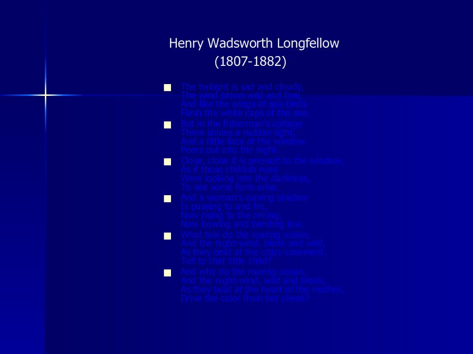 The twilight is sad and cloudy, The wind blows wild and free, And like the wings of sea-birds Flash the white caps of the sea. But in the fisherman's cottage There shines a ruddier light, And a little face at the window Peers out into the night. Close, close it is pressed to the window, As if those childish eyes Were looking into the darkness, To see some form arise. And a woman's waving shadow Is passing to and fro, Now rising to the ceiling, Now bowing and bending low. What tale do the roaring ocean, And the night-wind, bleak and wild, As they beat at the crazy casement, Tell to that little child? And why do the roaring ocean, And the night-wind, wild and bleak, As they beat at the heart of the mother, Drive the color from her cheek?