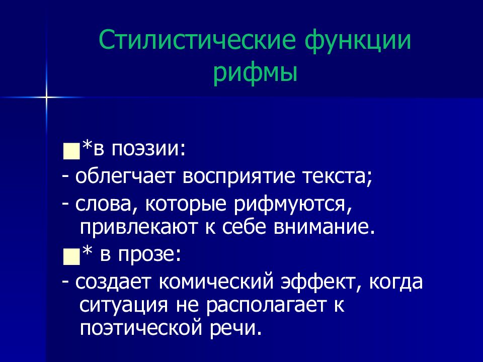 *в поэзии: - облегчает восприятие текста; - слова, которые рифмуются, привлекают к себе внимание. * в прозе: - создает комический эффект, когда ситуация не располагает к поэтической речи.