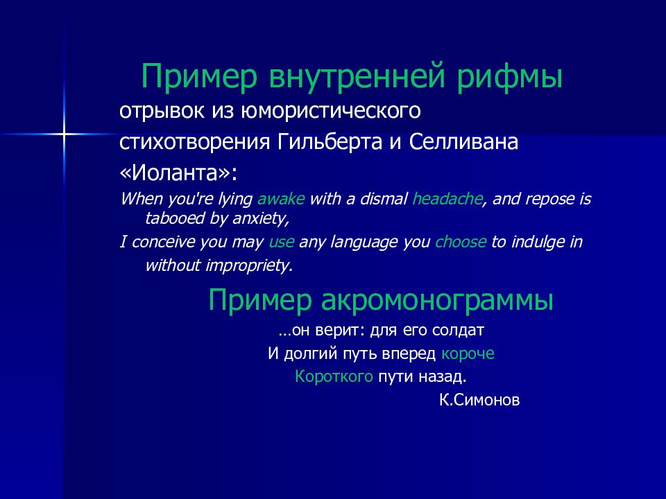 отрывок из юмористического стихотворения Гильберта и Селливана «Иоланта»: When you're lying awake with a dismal headache, and repose is tabooed by anxiety, I conceive you may use any language you choose to indulge in without impropriety. Пример акромонограммы …он верит: для его солдат И долгий путь вперед короче Короткого пути назад. К.Симонов