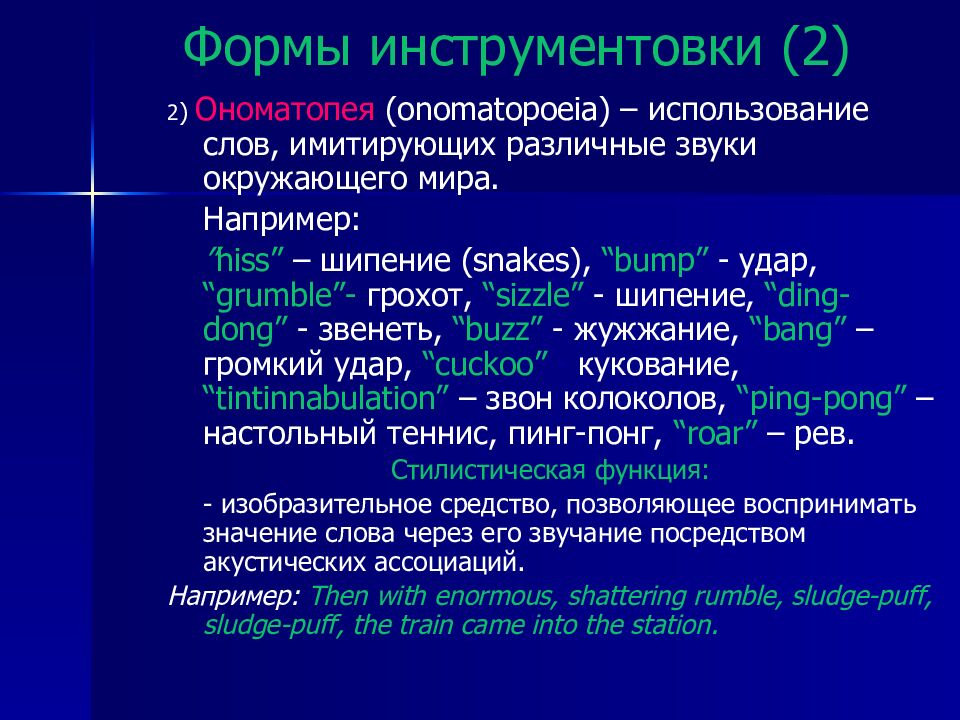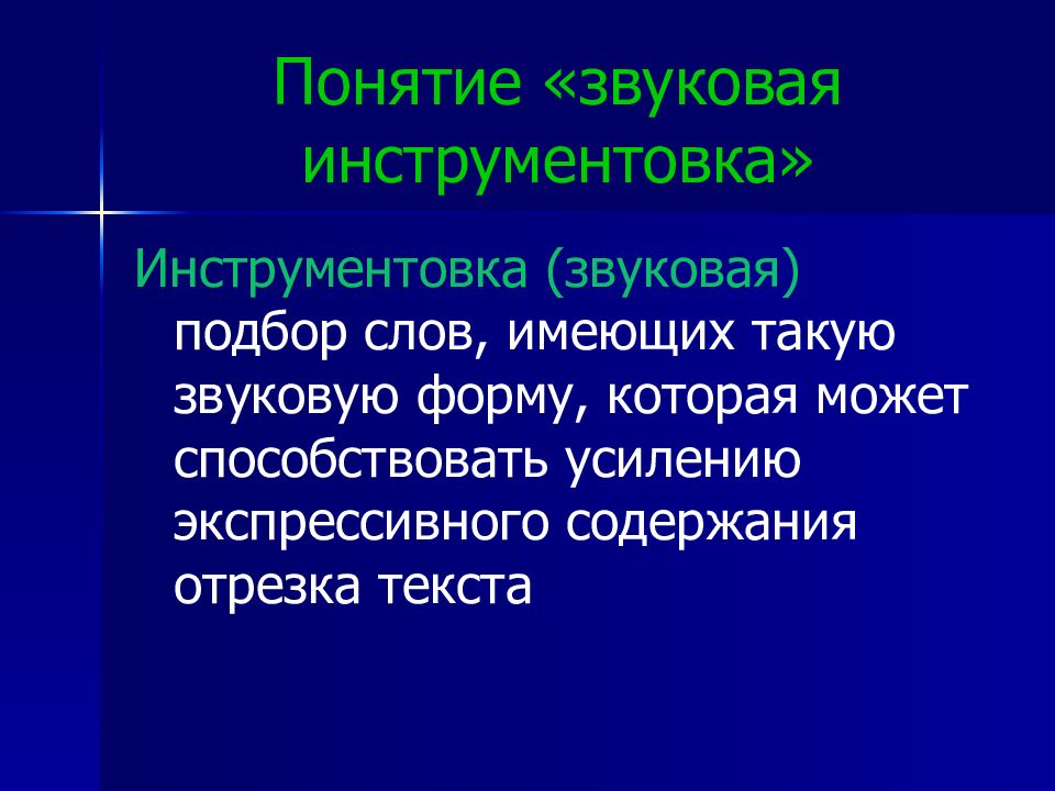 Инструментовка (звуковая) - подбор слов, имеющих такую звуковую форму, которая может способствовать усилению экспрессивного содержания отрезка текста