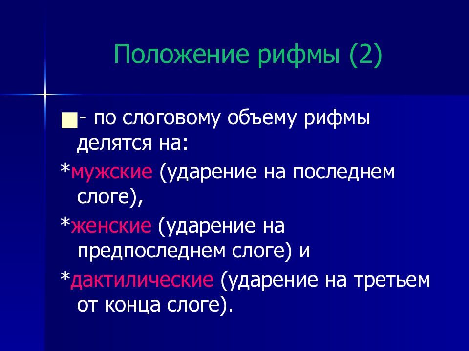 - по слоговому объему рифмы делятся на: * мужские (ударение на последнем слоге), * женские (ударение на предпоследнем слоге) и * дактилические (ударение на третьем от конца слоге).